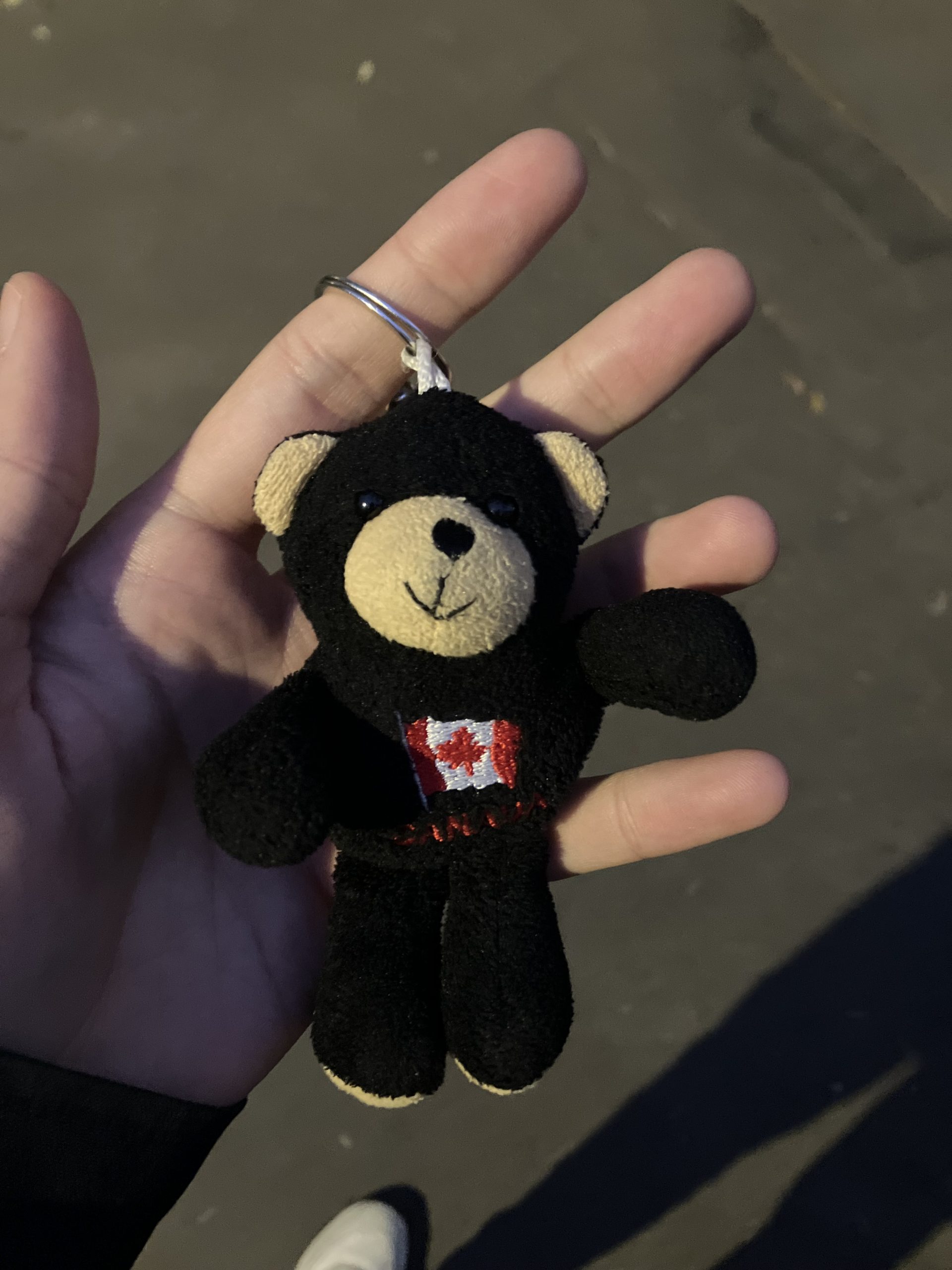 Objet trouvé : Petit ours noir porte-clé, museau marron, porte le drapeau du Canada sur le ventre. Mesure une dizaine de centimètres.
