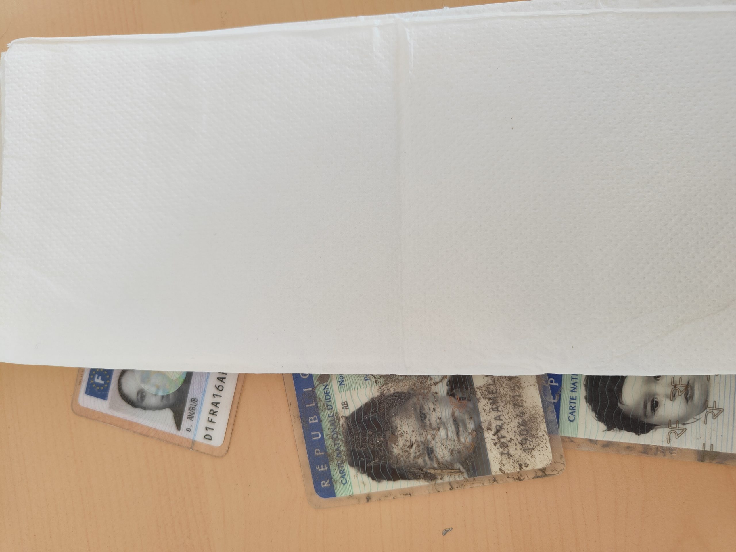 Portefeuille abimé (avec de la terre), contient carte vitale et permis de conduire de la dame, ainsi que deux cartes d'identités des enfants.