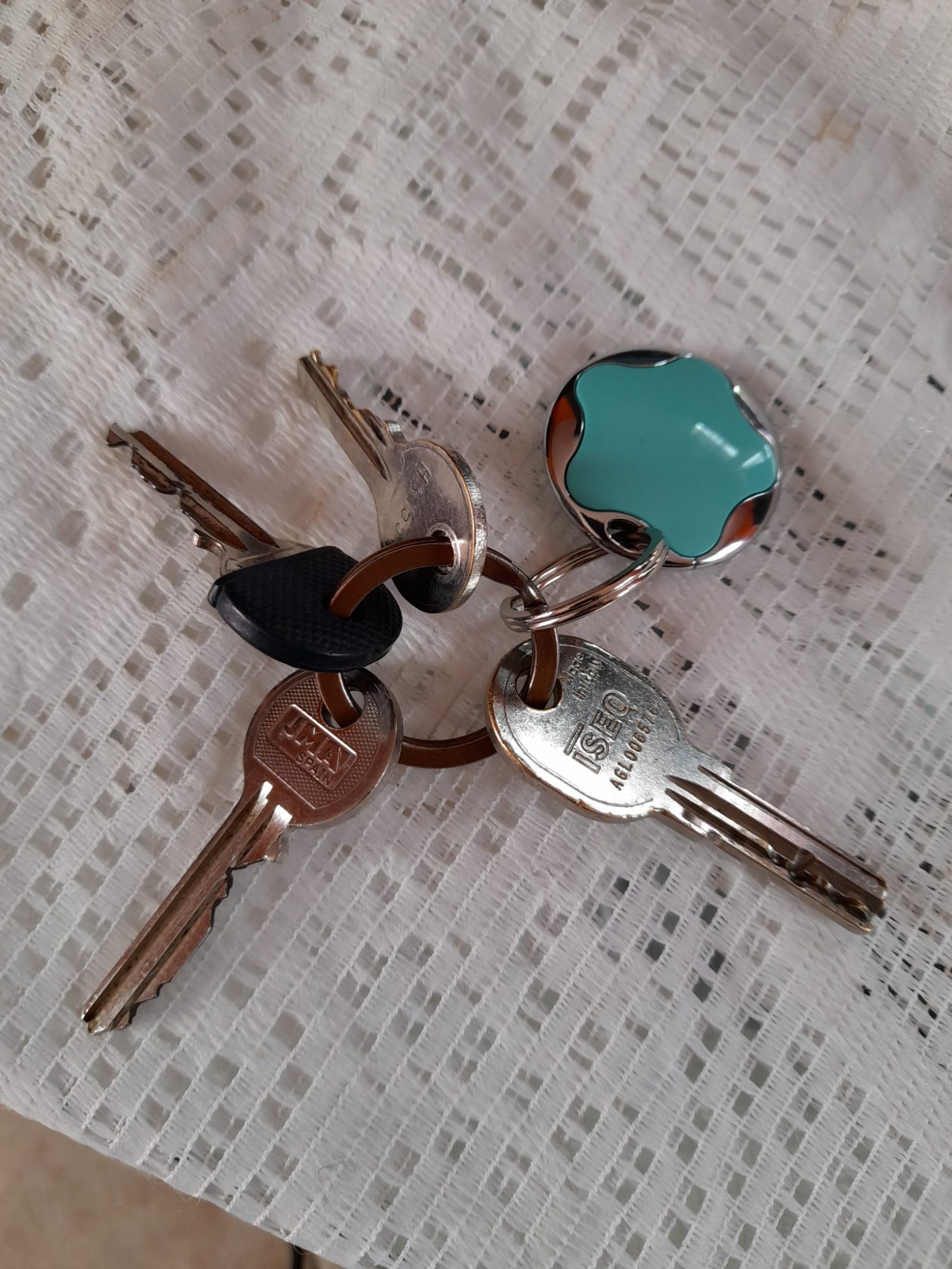 porte-clé de forme ronde avec une étoile de couleur "vert/cyan" au milieu portant 4 clés, dont une avec inscription Iseo, une avec JMA, une avec une lettre et des chiffres et une avec un capuchon noir. Toutes les clés sont de couleur "argenté". Trois avec des têtes rondes et une l'Iseo tête ovale.