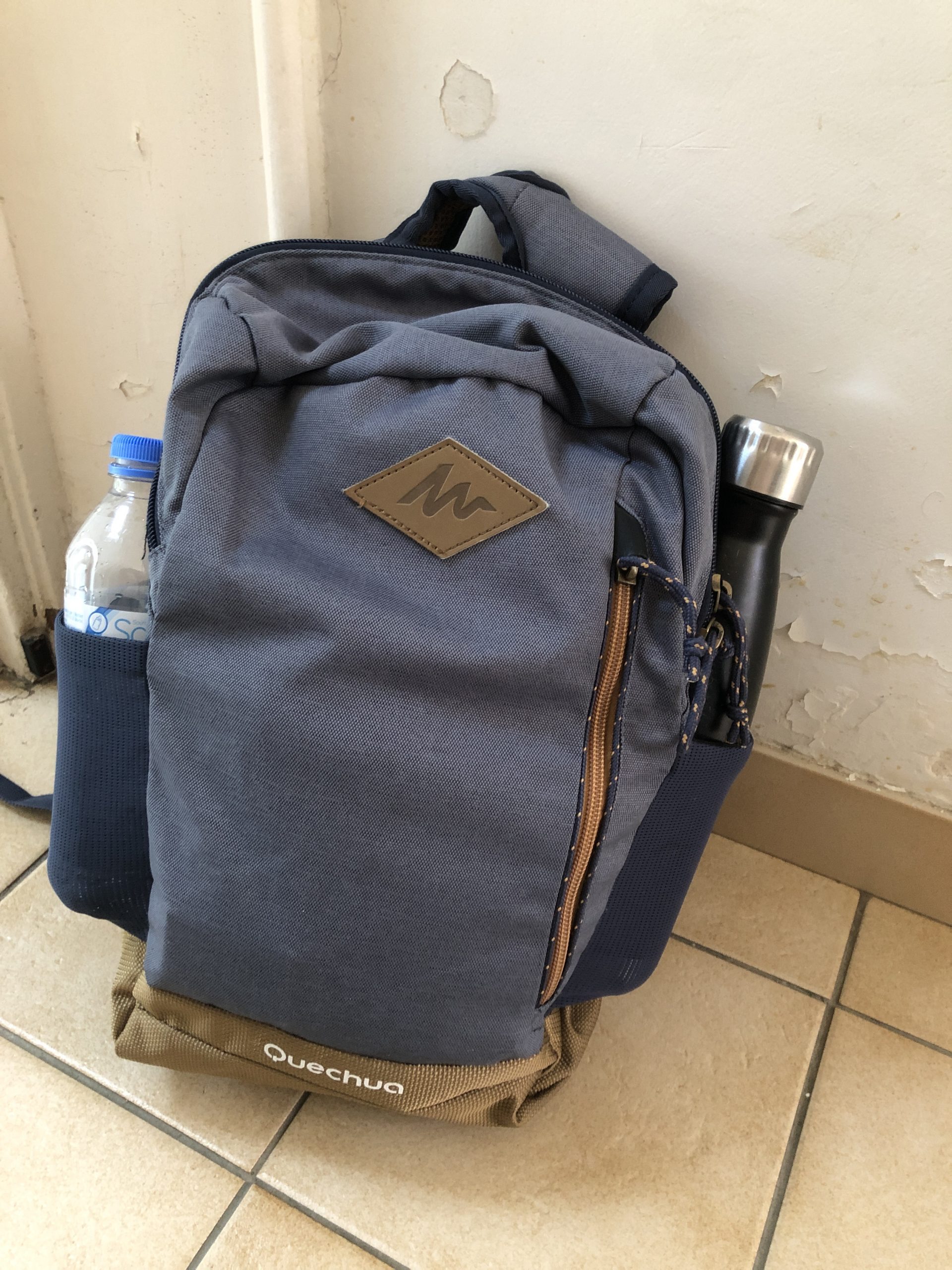 Objet trouvé : Petit sac à dos bleu Quechua. Avec gourde et bouteille d’eau sur les côtés .