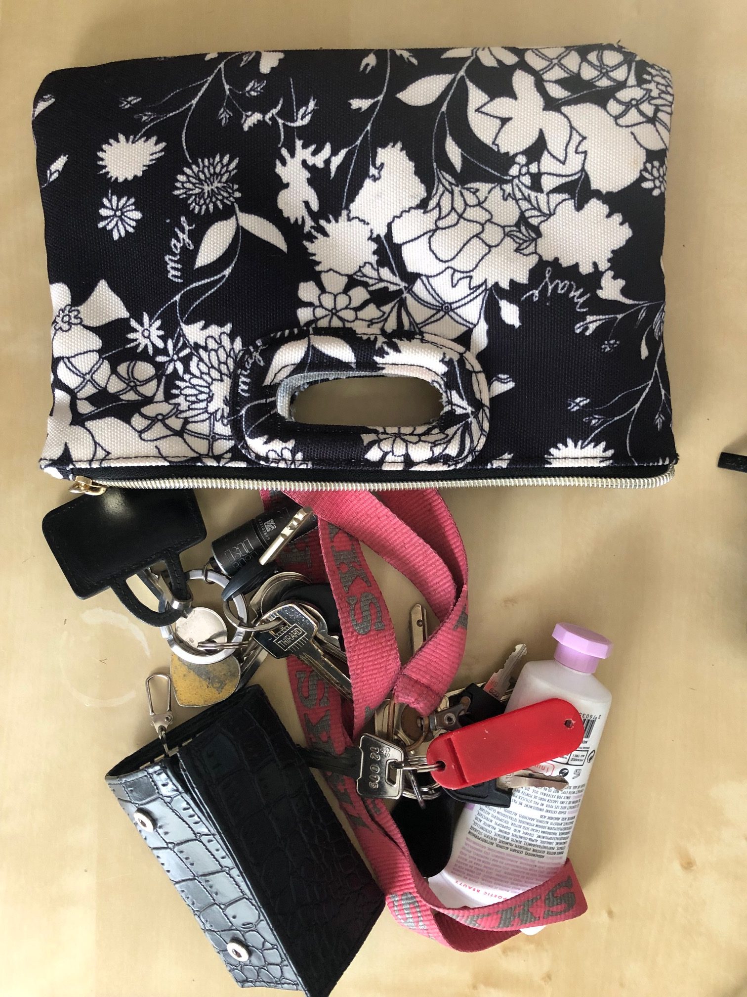 Objet trouvé : petit sac à main noir avec des motifs de fleurs blanches de 20cm sur 10cm à fermeture éclair avec poignées. le sac contient 3 trousseaux de clefs dont un noir, du maquillage, des badges d’accès à des parkings et des mouchoirs. aucun moyen de retrouver la personne