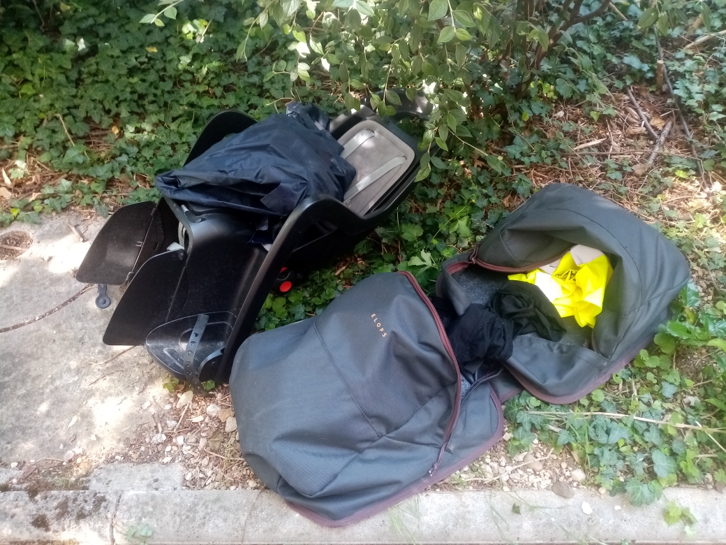 Deux sacoches de vélo reliées, contenant un gilet jaunes, une paire de gant, une cape de pluie. Un siège enfant.