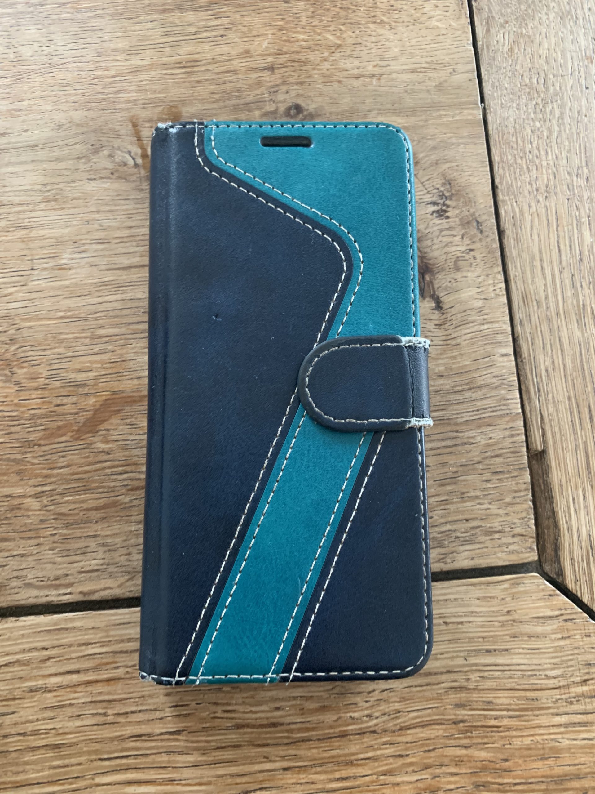 Objet trouvé : Smartphone dans housse à rabat en cuir bleue et verte
