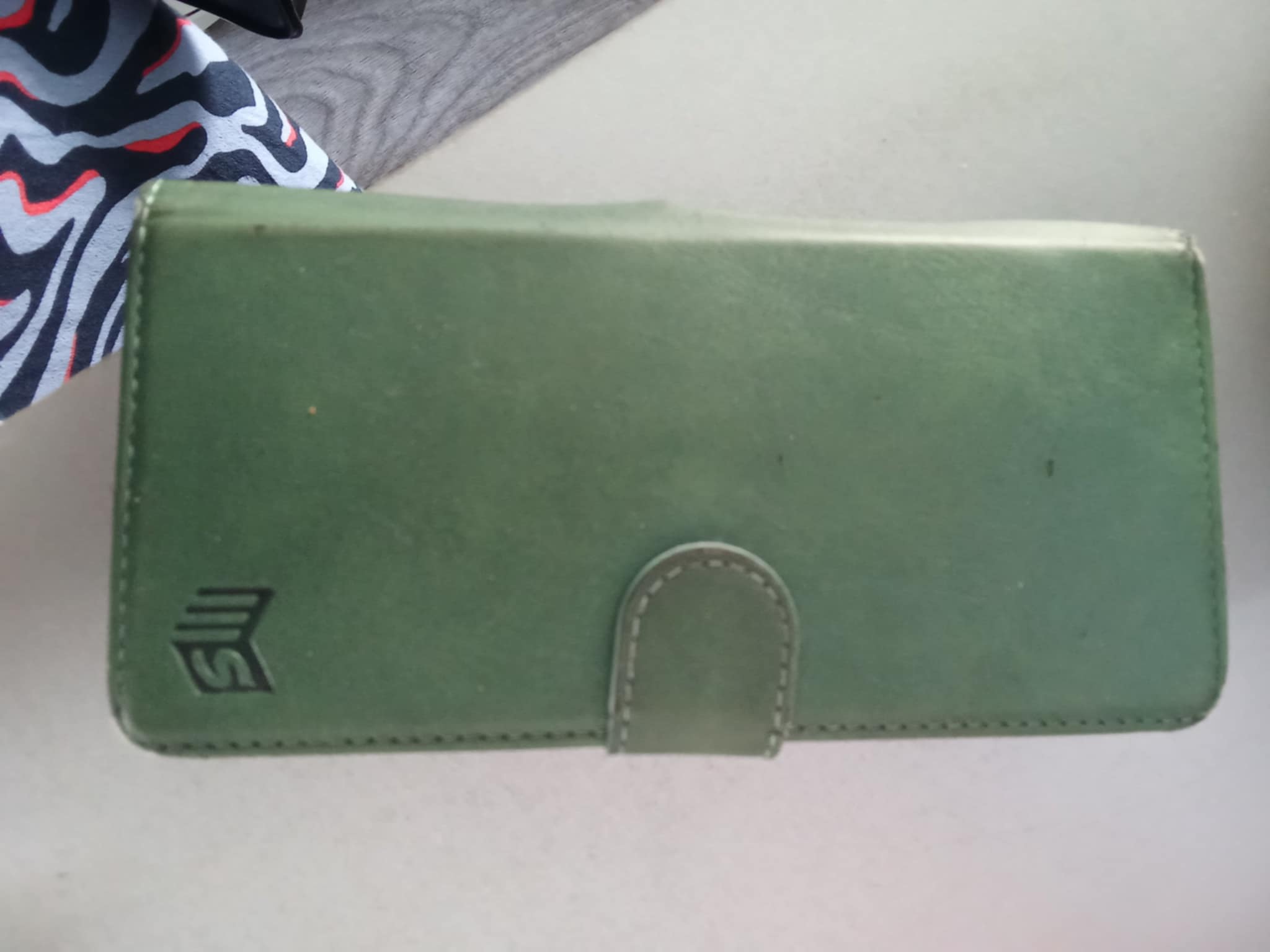 Téléphone avec protection verte, carte d'identité, permis de conduire, argent etc