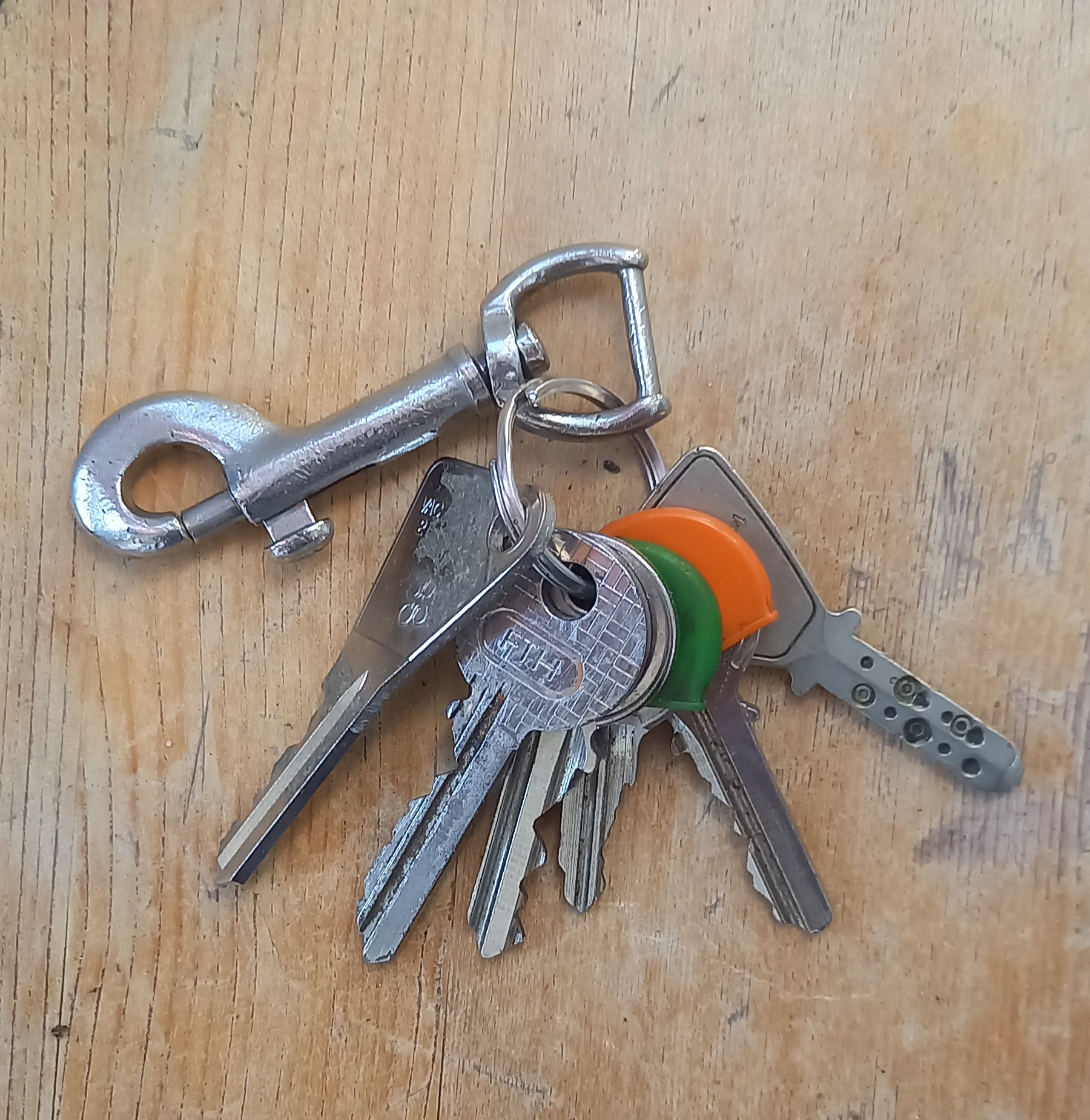 Objet trouvé : Trousseau 5 clés, dont une clé de sécurité, une clé avec une protection verte, une clé avec une protection orange. Le tout attaché à un mousqueton.