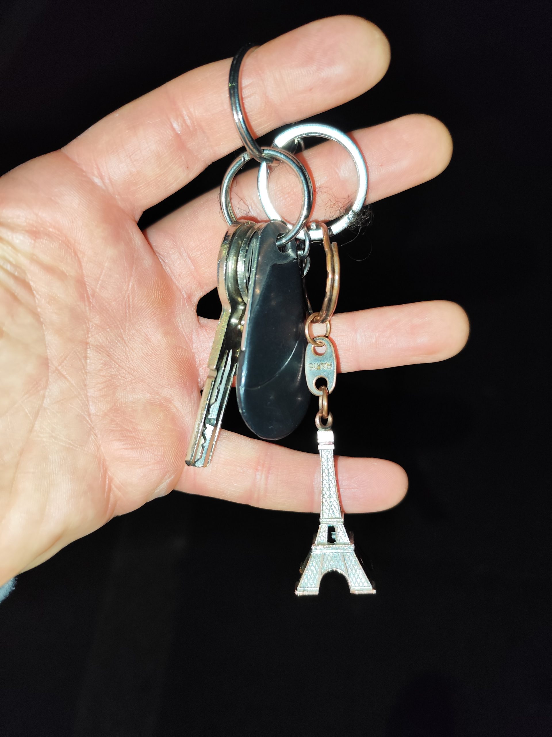 Objet trouvé : Porte-clés Tour Eiffel (inscription France, Paris) avec 4 anneau + Badge noir (081F48F7) + clé porte d'entrée ISEO (AGL003083) + clé d'appartement City (KCF003882)