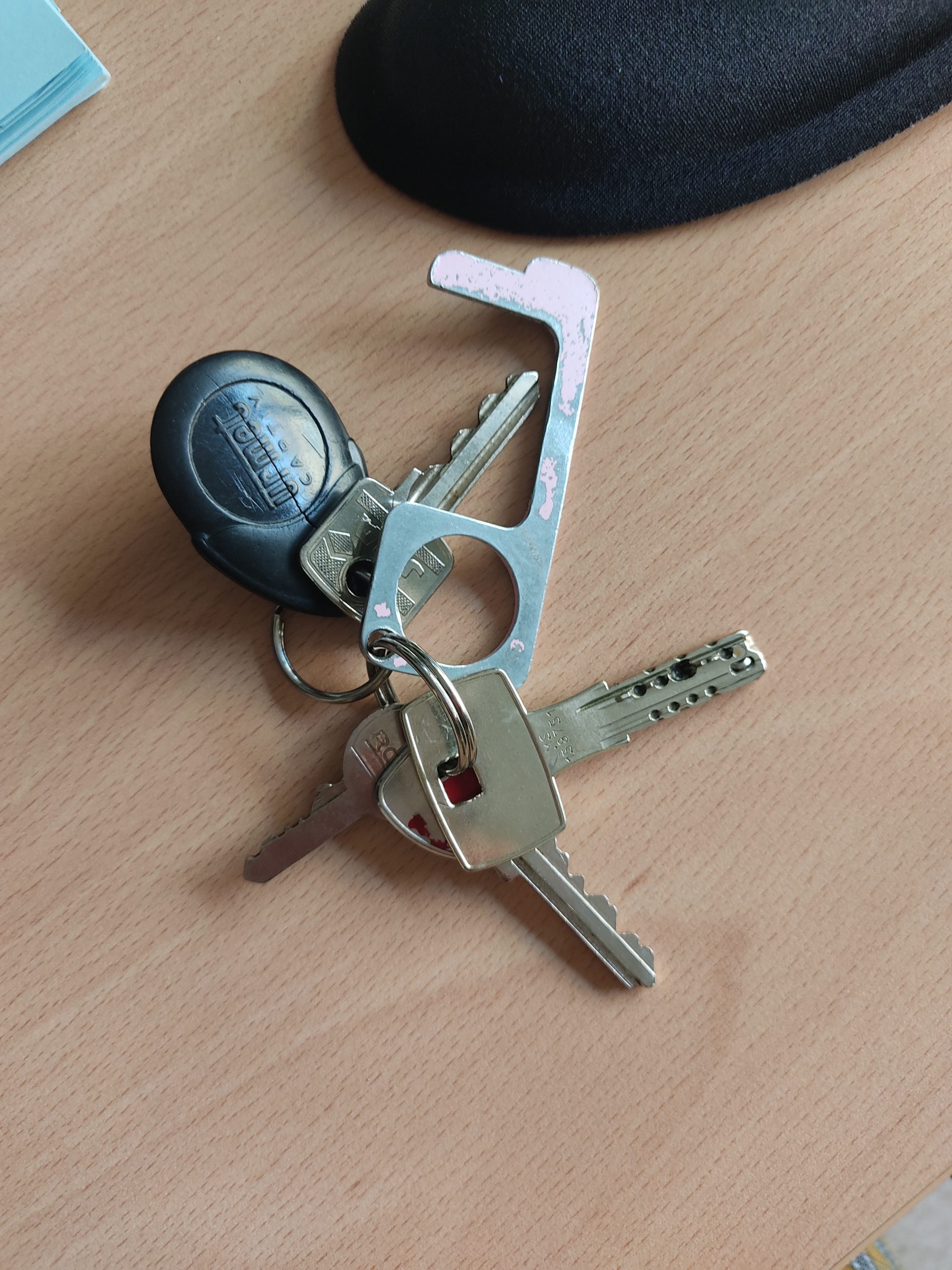 Objet trouvé : Trousseau 4 clés dont une couleur effacée, une reseembalnt à clé de cadenas, une pour porte d'entrée sécurisée un bip noir d'accès a immeuble, et un objet métallique utilisé lors du COVID pour appuyer sur les boutons d'ascenseur ou ouvrir les portes.