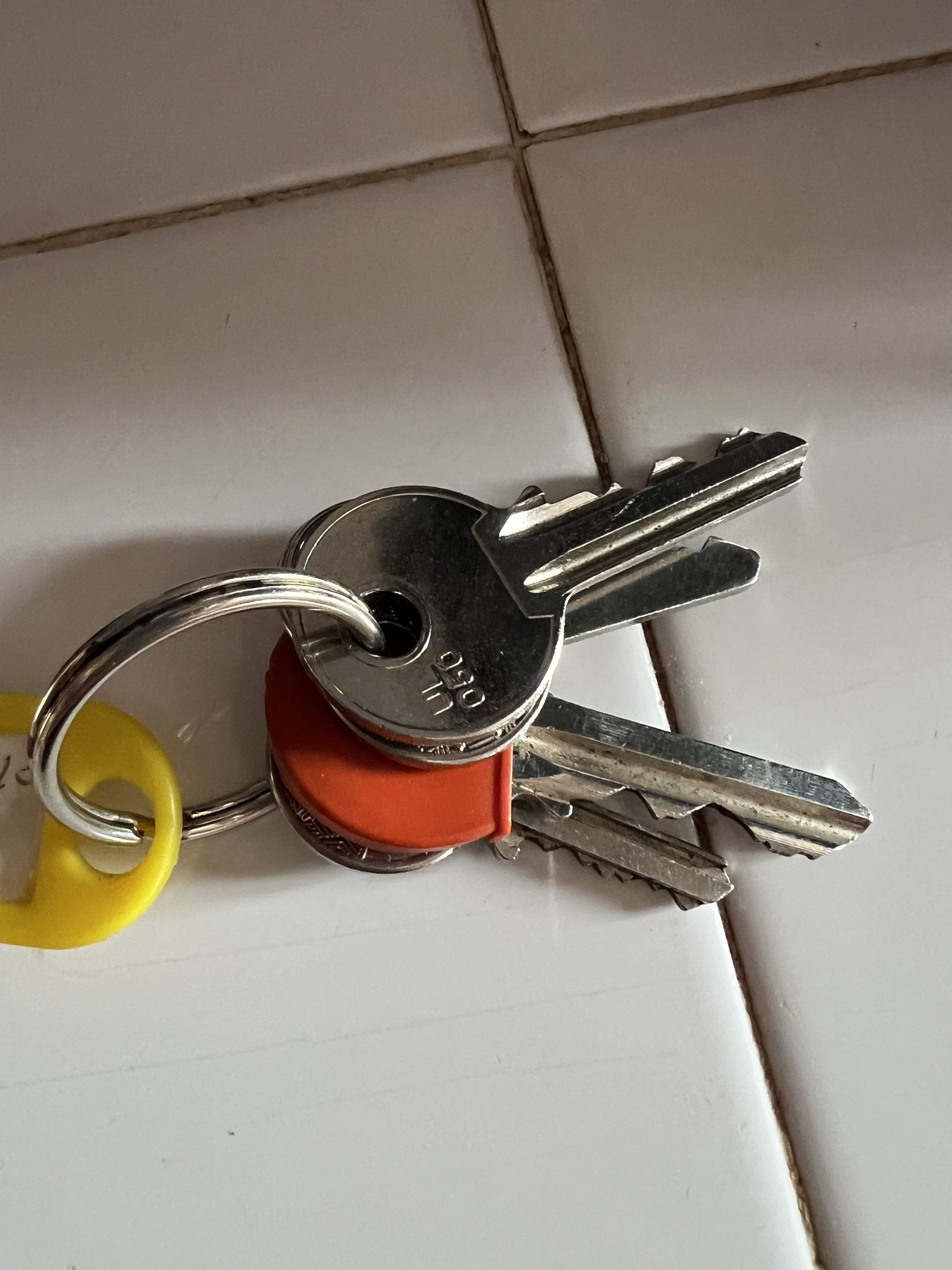 Objet trouvé : Trousseau de 4 clés avec un porte nom en plastique jaune marqué TRINTANELLO 1 S