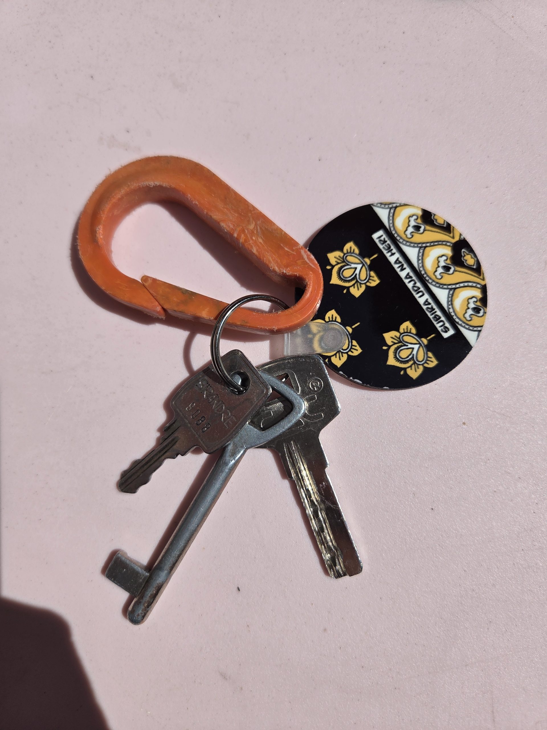Un trousseau de 3 clefs avec 2 portes clefs, un mousqueton orange en plastique et un médaillon en plastique