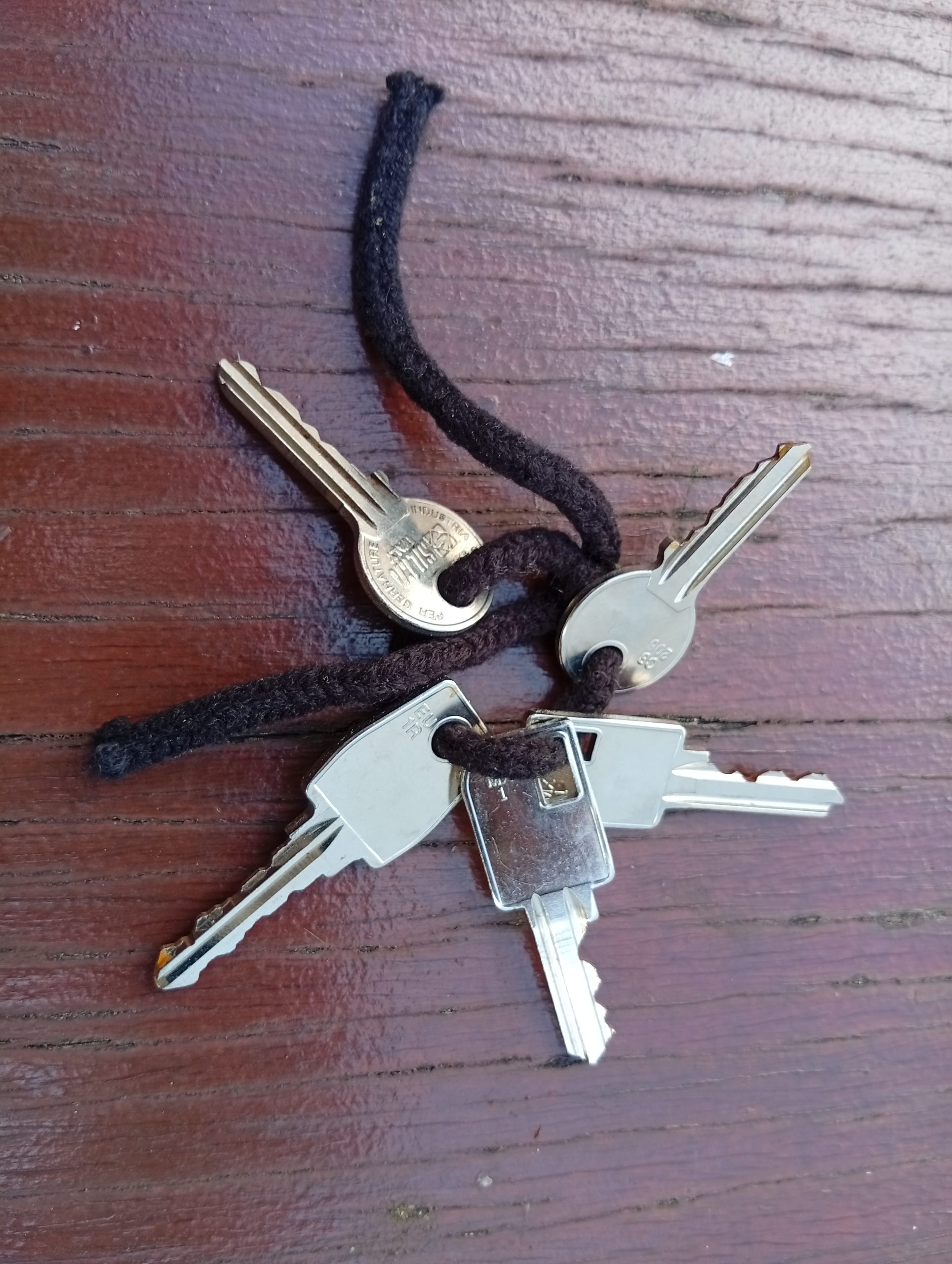 2 clefs semblant identiques, têtes rectangulaire ; une autre avec la tête rectangulaire plus grosse et deux clefs à têtes rondes, reliées par lien épais noir.