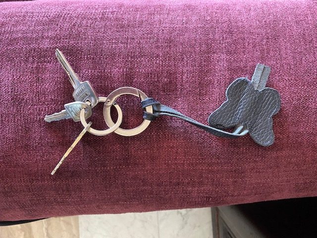Objet trouvé : Trousseau de 3 clefs dont une de boîte à lettres sans doute, accrochées à un premier anneau, lui-même relié à un gros anneau, lequel est relié à un collier en cuir noir en forme de papillon.
