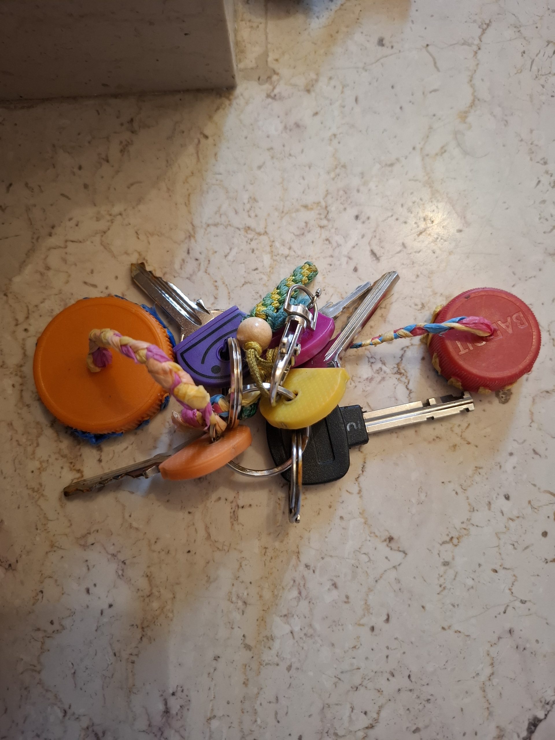 Objet trouvé : Trousseau de 5 clés avec portes clés fabriqué avec des bouchons rouge et orange de bouteille . "Chapeaux" de clés orange, jaune rose et violet