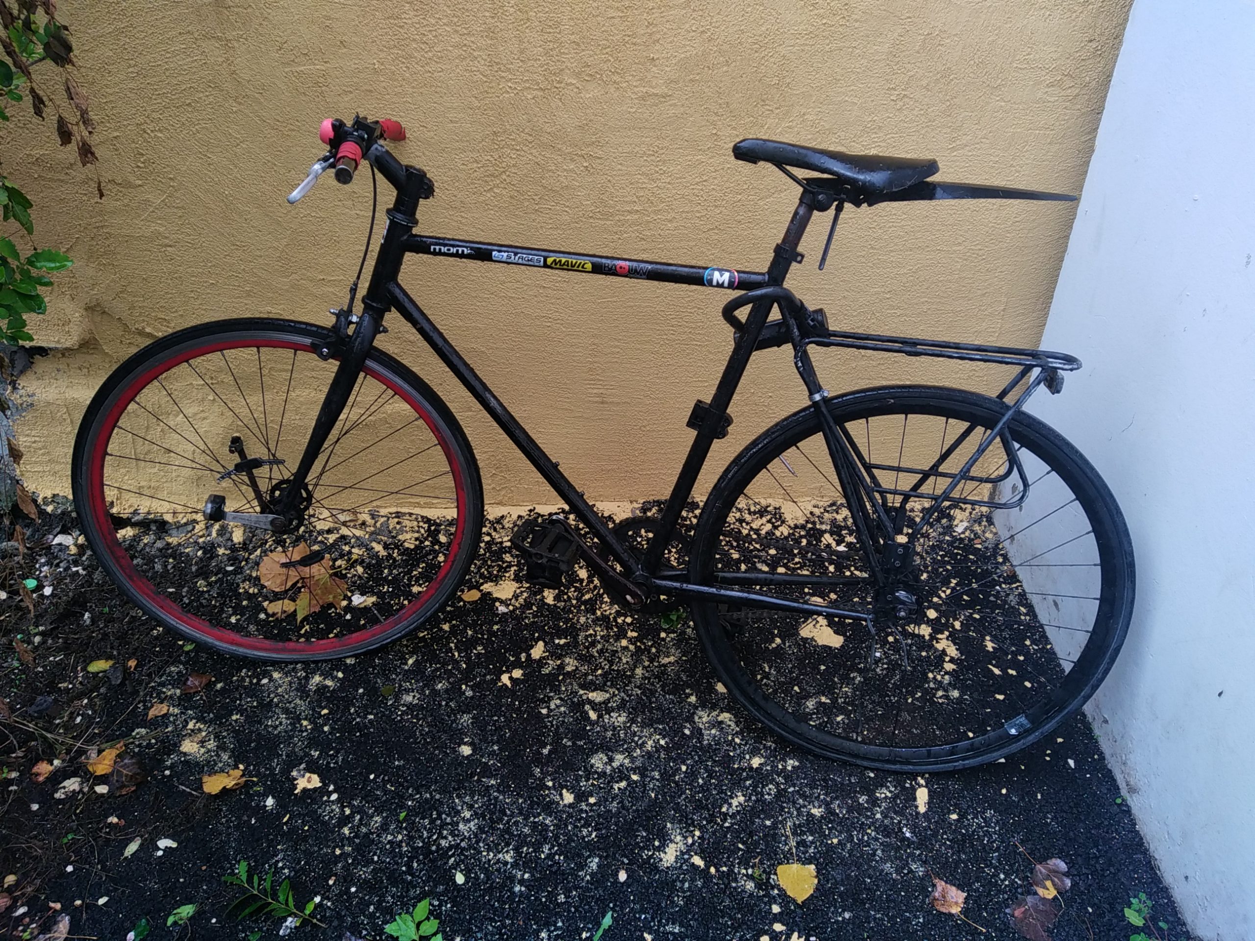 Objet trouvé : Il y a un vélo abandonné dans le bosquet derrière chez moi. Il y a un numéro d'inscrit sur l'axe avant 1082 ou un truc comme ca. Divers autocollants : MOM, MAVIC, METRO, …