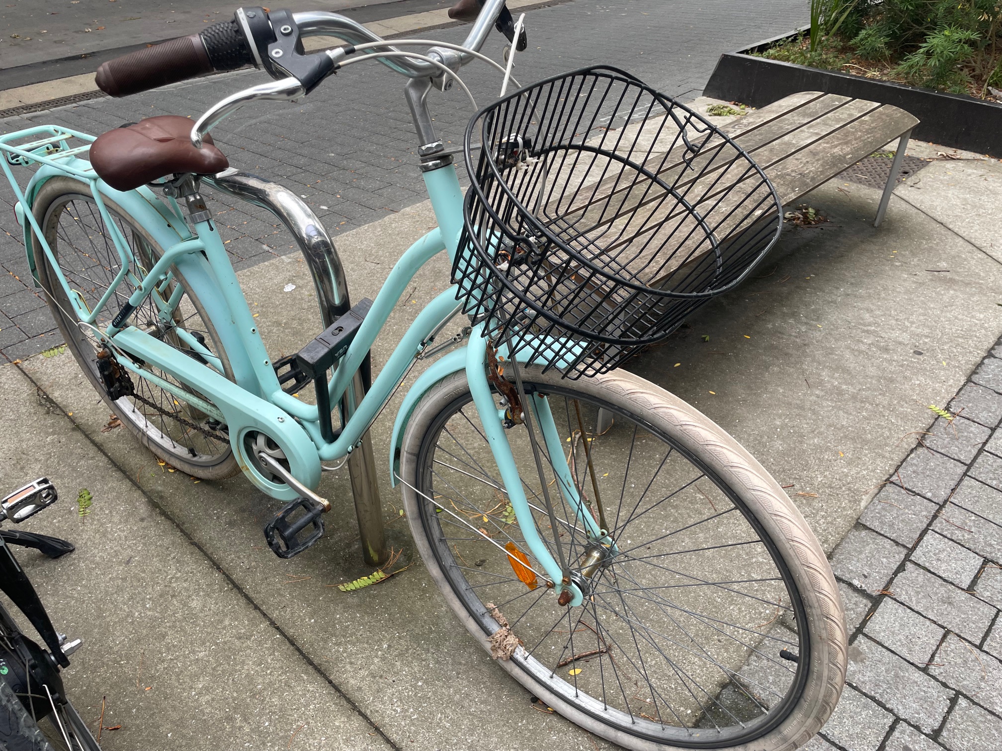 Objet trouvé : Vélo de ville bleu claire, est attaché depuis plus de 3 mois au même endroit, quelqu'un la laissé attaché à un porte vélo devant la boutique Carli, à St Nazaire, sans revenir le chercher
