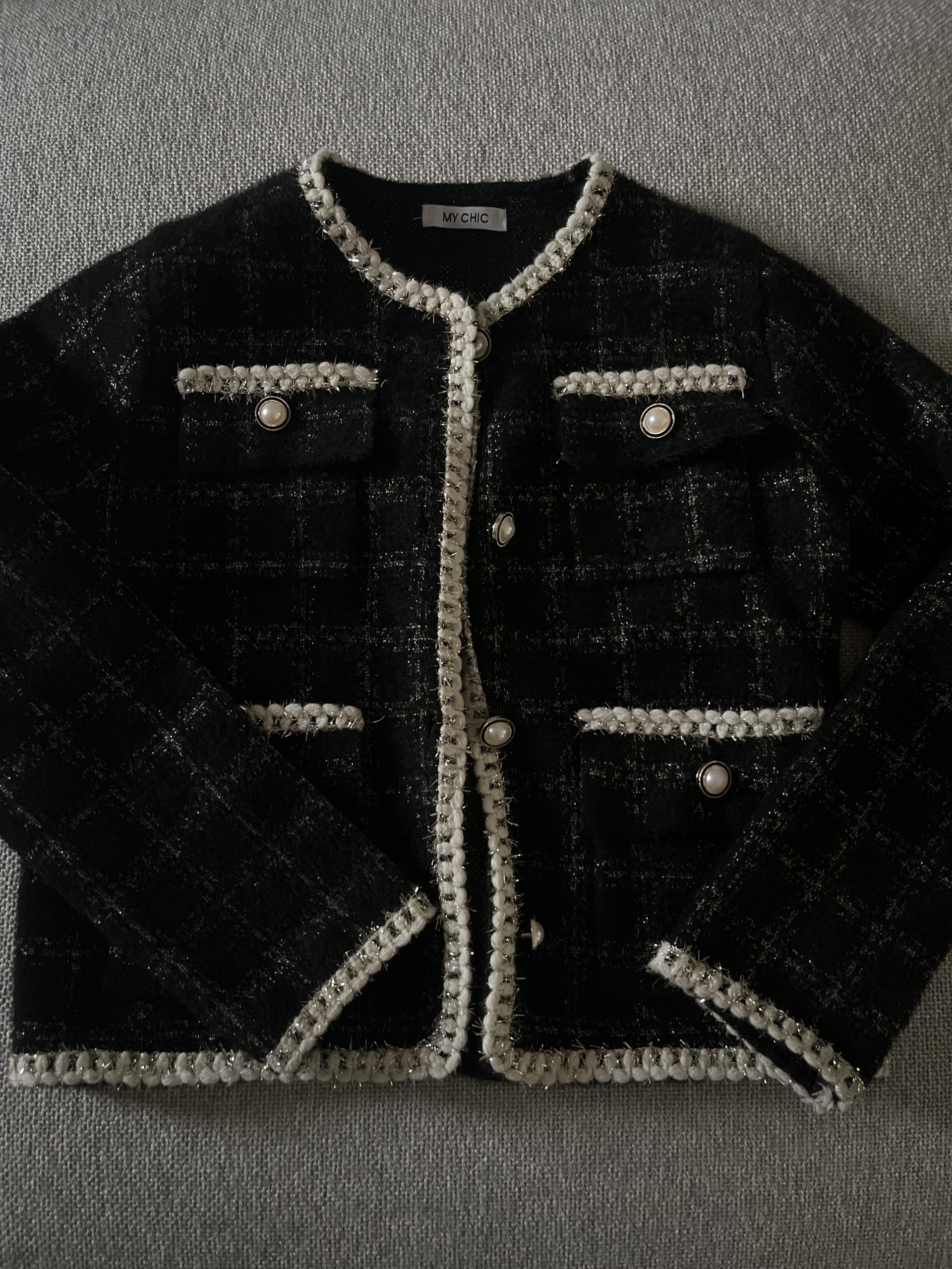 Veste femme courte noire avec des liserets blancs, 2 poches en bas et deux poches en haut. Des boutons nacrés.